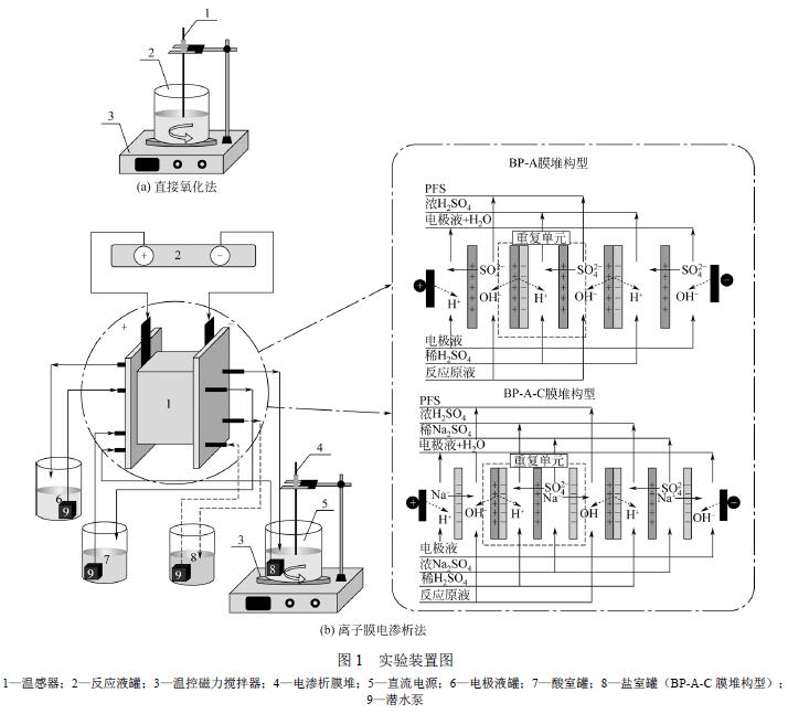 直接氧化法制備PFS 的實驗裝置如圖1(a)所 示,圖中1 為溫感器,2 為反應液罐,3 為溫控磁力 攪拌器(HJ-3 型,常州國宇儀器制造有限公司)。 離子膜電滲析法制備PFS的實驗裝置如圖1(b) 所示。其中,4 為電滲析膜堆;5 為直流電源 (RLD-3005D1 型,上海寰振電子科技有限公司); 6 為電很液罐;7 為酸室罐;8 為鹽室罐;9 為潛 水泵(JY-PG70 型,杭州吉印文化藝術有限公司)。 本文主要采用兩種電滲析膜堆構型:BP-A 構型和 BP-A-C 構型,BP-A 構型膜堆由3 張陰離子交換 膜和3 張雙很膜組成;BP-A-C 構型膜堆由3 張陰 離子交換膜、3 張陽離子交換膜和3 張雙很膜組成,每張膜的有效面積為0.002m2,膜的性能如表1 所示。