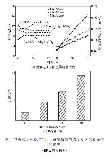 電流密度對膜堆電壓和酸室罐硫酸濃度的影 響(BP-A 膜堆構型)如圖5(a)所示,首先,膜堆電 壓隨著電流密度的增加而上升,說明大部分電能用 來克服由電流密度增加而增加的膜堆電阻[15-16];其 次,能耗隨著電流密度的增加而降低;較后,隨著 電流密度從10mA/cm2 增加到30mA/cm2,酸室中的 較終硫酸濃度從0.27mol/L 升高到0.42mol/L,原因 在于電流密度增加導致雙很膜發生水解離的驅動 力增加,此外,硫酸濃度的增加程度與電流密 度的增加程度不成比例,原因在于氫離子透過陰離 子交換膜發生泄漏,且電流密度越高、泄漏越 嚴重。電流密度對PFS 鹽基度的影響如圖5(b)所 示,電流密度從0 增加到30mA/cm2,鹽基度從7.68% 增加到20.13%,提高程度很顯著。主要原因在于電 流密度增大,雙很膜產生的OH–量越多,更多的OH- 參與水解反應,從而增加鹽基度。