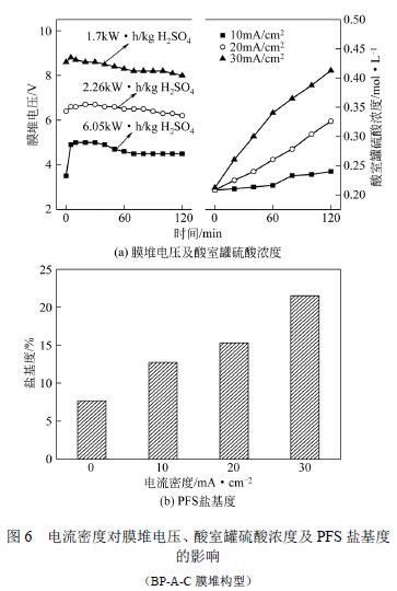 操作條件:反應溫度設置為常溫,反應時間設 置為120min,反應原料組成為1.67mol/L H2SO4 和 4.30mol/L FeSO4(硫酸亞鐵和硫酸的摩爾比為 2.58),膜堆為BP-A-C 構型,電流密度設置為0、 10mA/cm2、20mA/cm2、30mA/cm2。 圖6 是電流密度對膜堆電壓、酸室罐硫酸濃度 以及PFS 鹽基度的影響(BP-A-C 膜堆構型)。對比 圖5 可知:,同樣的電流密度下,BP-A 構型 的膜堆電壓要比BP-A-C 的高,因此BP-A 構型的 膜堆能耗比BP-A-C 的高,主要原因是本實驗中制 得的PFS 是無機高分子聚合物,其電導率較小,相 比BP-A 膜堆構型,BP-A-C 膜堆構型增加一個鹽室, 可以提供多余的電解質離子導電,因此降低了膜堆電阻;第二,同樣的電流密度下,兩種膜堆構型 較終得到的硫酸濃度相似;第三,相同的電流密 度下,兩種不同構型膜堆制備出來的PFS 鹽基度 差別不大,因此,膜堆構型對鹽基度的改善作用 不明顯。